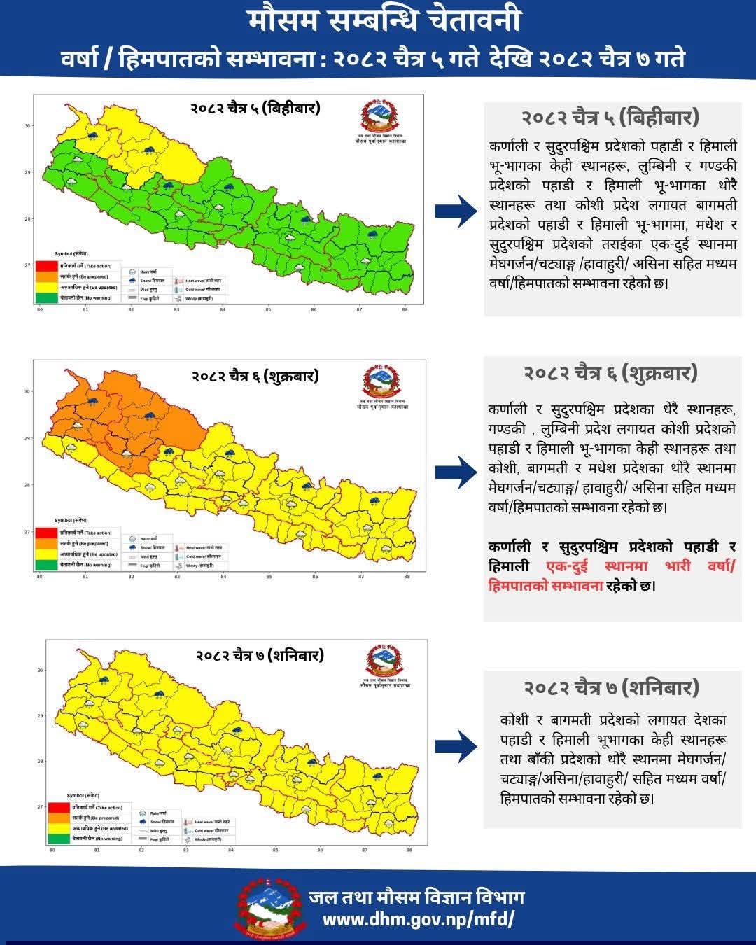 प्राधिकरणले सर्वसाधारणलाई उच्च सतर्कता अपनाउन अनुरोध समेत गरेको छ। जल तथा मौसम विज्ञान विभागको मौसम पूर्वानुमानलाई उद्धृत गर्दै प्राधिकरणले चैत ६ गते शुक्रबारदेखि मौसममा उल्लेख्य बदलाव आउने जानकारी दिएको हो।