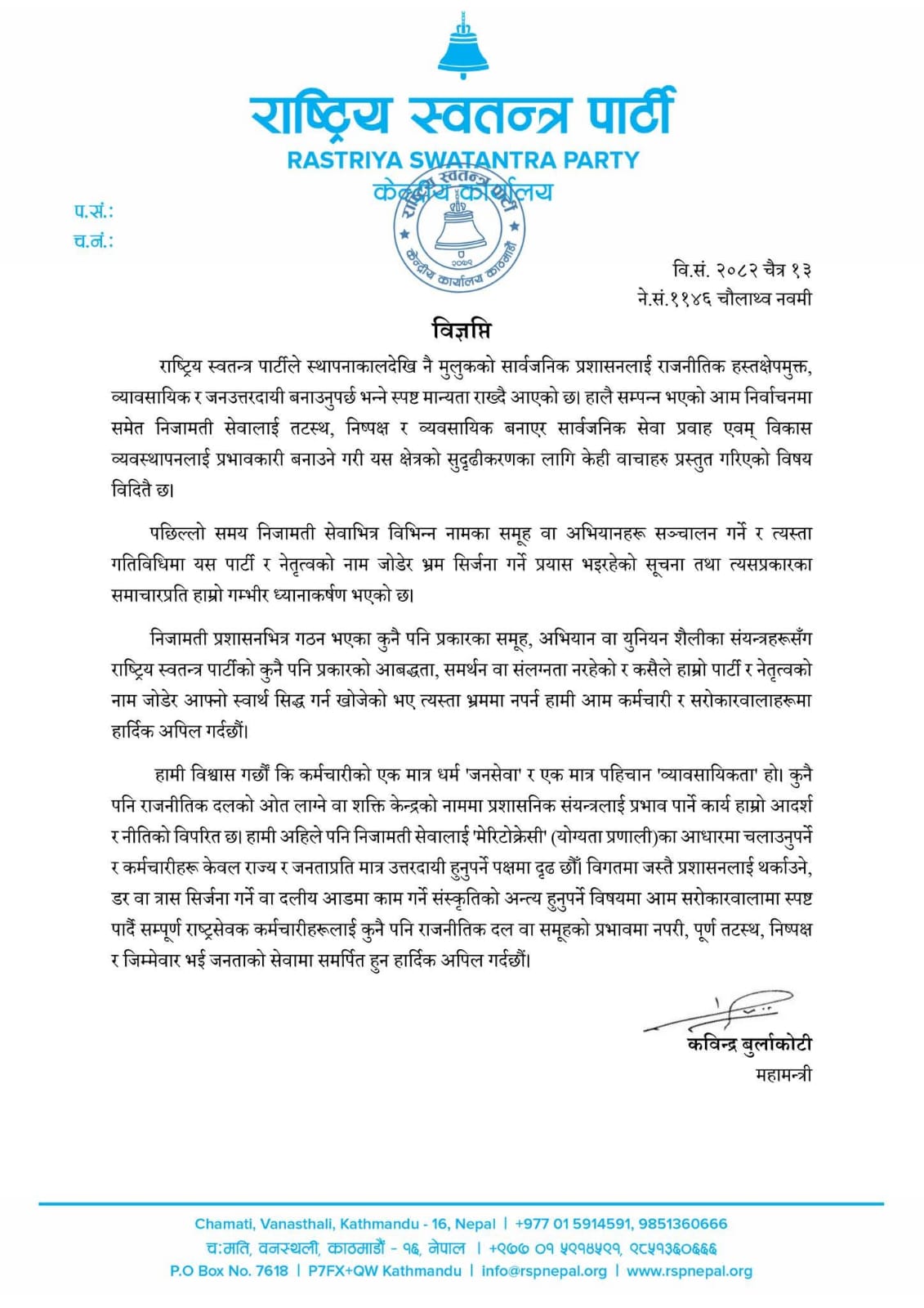 काठमाडौं । राष्ट्रिय स्वतन्त्र पार्टी (रास्वपा) ले निजामती सेवामा कुनै पनि प्रकारको राजनीतिक हस्तक्षेप, आबद्धता वा समर्थन नरहेको स्पष्ट पारेको छ । पार्टीका महामन्त्री कविन्द्र बुर्लाकोटीद्वारा जारी विज्ञप्तिमा यस्तो धारणा सार्वजनिक गरिएको हो ।
