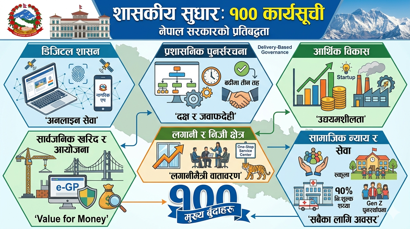 नेपाल सरकारको मन्त्रिपरिषद्बाट २०८२ चैत १३ गते स्वीकृत “शासकीय सुधार सम्बन्धी एक सय कार्यसूची” का मुख्य बुँदाहरू निम्न रहेका छन्: