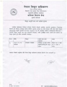प्राधिकरणले नरेफाट, सिसिआरसी कलेज आसपास, सूर्यकोटमार्गमा बिजुली कटौती गर्ने भएको हो ।