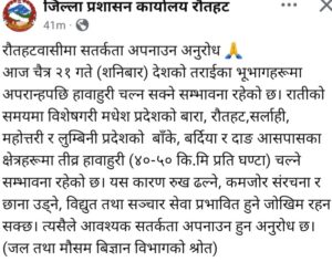 प्रशासनले आज (शनिबार) सामाजिक सञ्जालमार्फत एक सूचना जारी गरी तराईका भू–भागहरूमा अपराह्नपछि हावाहुरी चल्ने सम्भावना रहेको जनाएको हो। विशेषगरी रातिको समयमा मधेश प्रदेशका रौतहट, बारा, सर्लाही र महोत्तरी तथा लुम्बिनी प्रदेशका बाँके, बर्दिया र दाङ आसपासका क्षेत्रमा ४० देखि ५० किलोमिटर प्रतिघण्टाको रफ्तारमा तीव्र हावाहुरी चल्न सक्ने पूर्वानुमान गरिएको छ ।