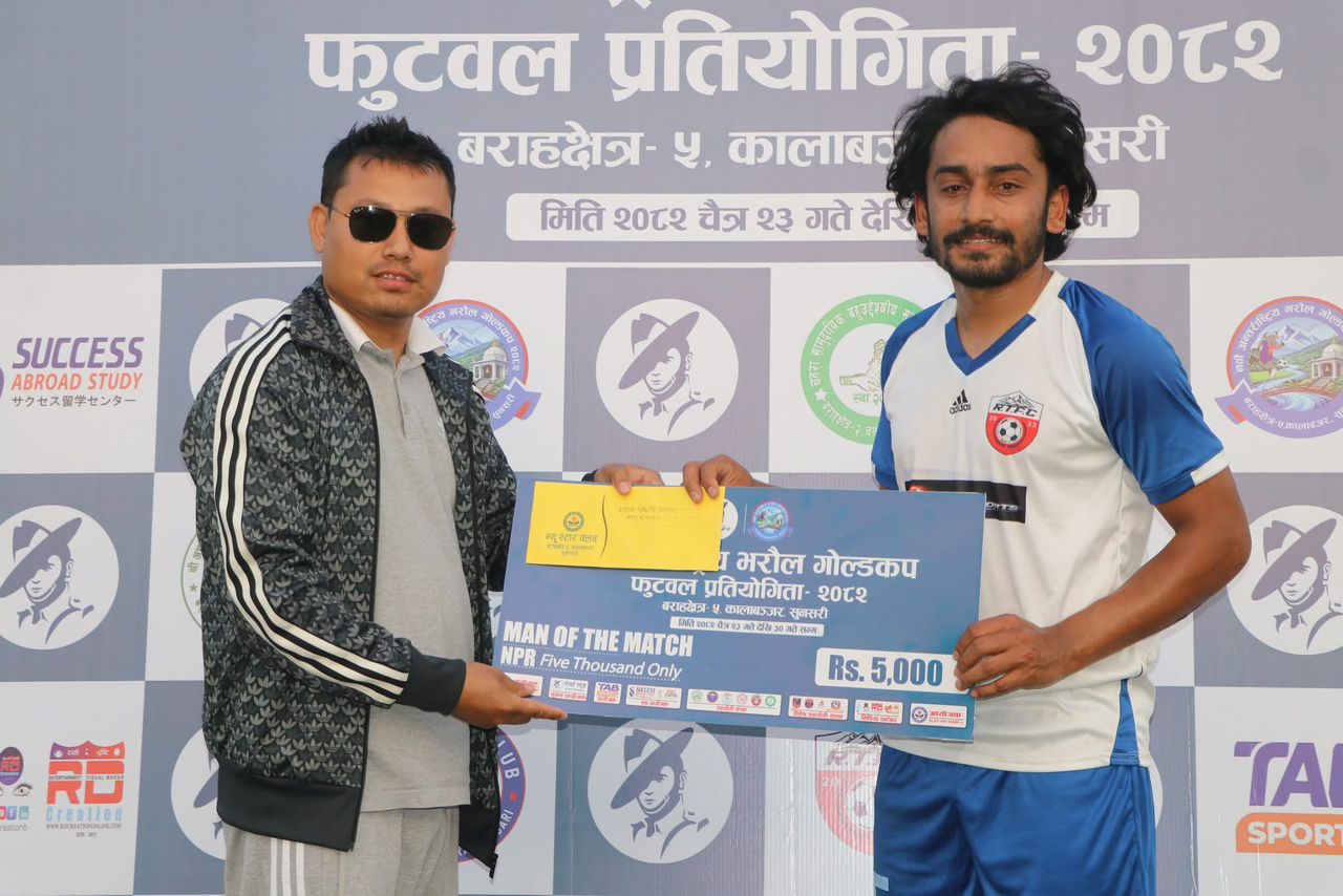 सुनसरीको बराहक्षेत्र–५, कलाबञ्जारस्थित ज.डे.जे. भरौला खेल मैदानमा जारी आफ्नो पहिलो खेलमै आरटी एफसीले यङ ब्रदर्स क्लब सुनसरीलाई २–० गोल अन्तरले पराजित गरेको हो ।