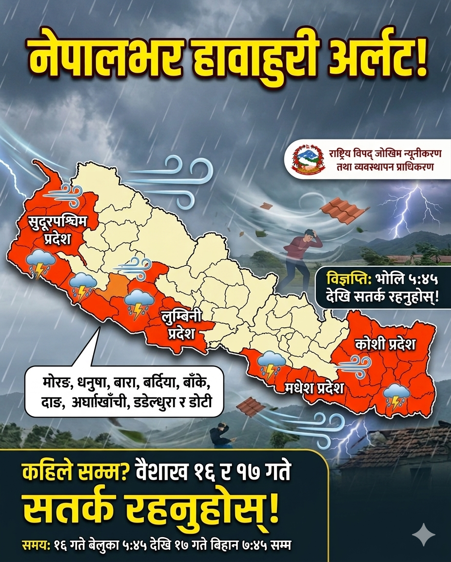 गृह मन्त्रालय अन्तर्गतको राष्ट्रिय विपद् जोखिम न्यूनीकरण तथा व्यवस्थापन प्राधिकरणले देशका विभिन्न भागमा तीव्र गतिको हावाहुरी चल्ने सम्भावना रहेको भन्दै सर्वसाधारणलाई उच्च सतर्कता अपनाउन आग्रह गरेको छ।